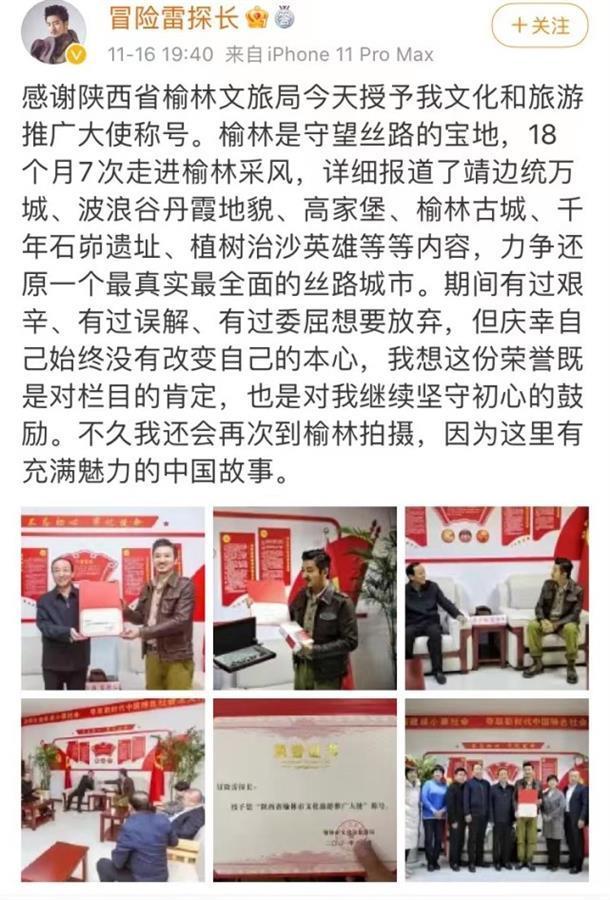 “冒险雷探长”发布的微博称,榆林是守望丝路的宝地,自己18个月7次走进榆林采风,详细报道了靖边统万城、波浪谷丹霞地貌、高家堡、榆林古城、千年石峁遗址、植树治沙英雄等等内容,力争还原一个最真实最全面的丝路城市。