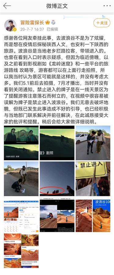 “冒险雷探长”还称,拍摄节目本意不是为了炫耀,而是想在疫情后探秘陕西人文,也安利一下陕西的旅游资源。“禁止进入”的牌子是一线天景区为了提醒游客注意落石而树立的,容易被误解为牌子是禁止进入波浪谷,他们无意去破坏地貌。