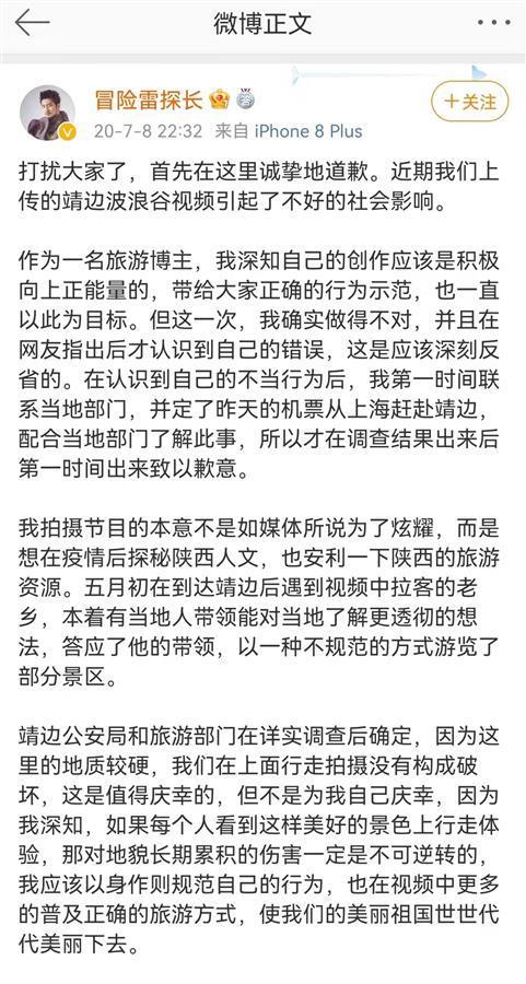 该事件发生后,“冒险雷探长”于2020年7月8日发布微博解释自己的行为,并表示道歉。他说,作为一名旅游博主,他深知自己的创作应该是积极向上、正能量的,带给大家正确的行为示范,也一直以此为目标。但这一次,他确实做得不对,并且在网友指出后才认识到自己的错误,应该深刻反省。在认识到不当行为后,他从上海赶赴靖边配合当地部门调查此事,并在调查结果出来后第一时间出来致以歉意。