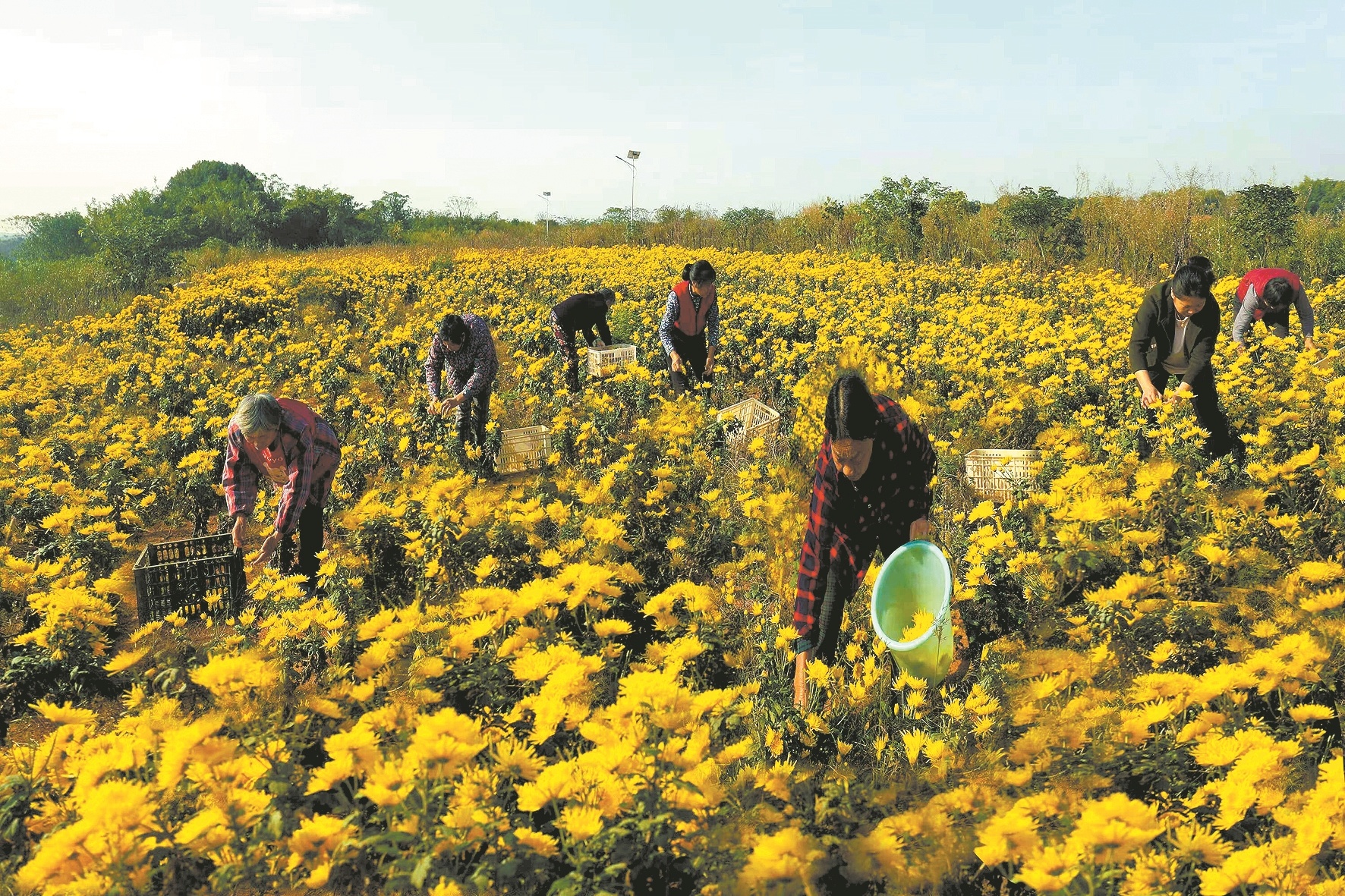 村民们在采摘金丝皇菊