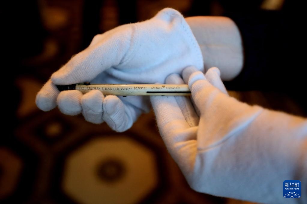 11月16日,在英国伦敦狄更斯博物馆,工作人员展示狄更斯妻子凯瑟琳送给狄更斯的钢笔笔身。新华社记者 李颖 摄