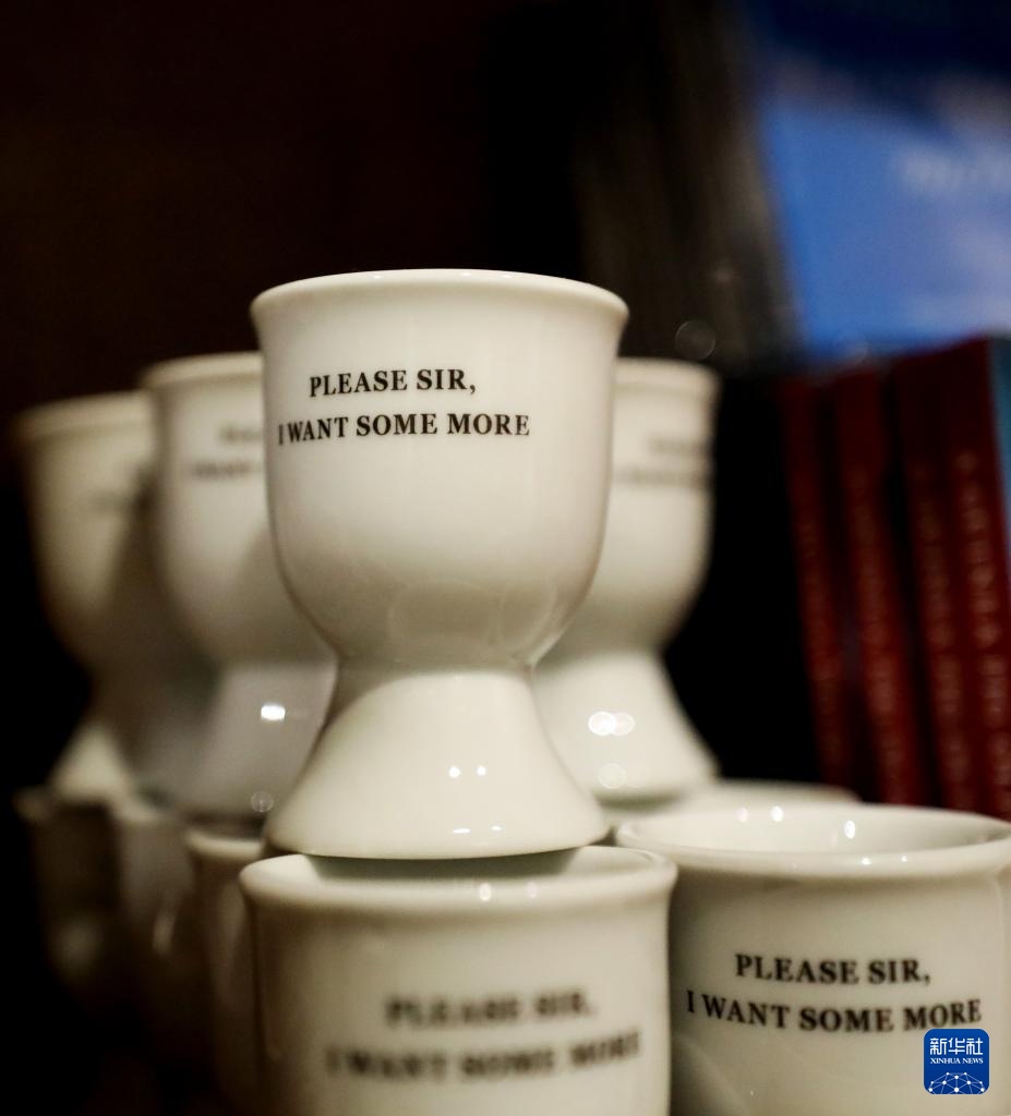 这是11月16日在英国伦敦狄更斯博物馆纪念品店拍摄的杯子,上面写着《雾都孤儿》中的名句“先生,请再给我一些”。新华社记者 李颖 摄
