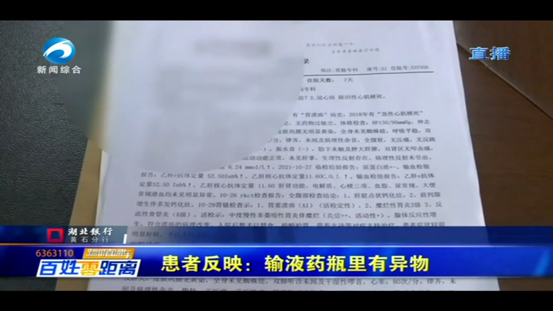 近日,黄石市市民李女士跟我们记者报料,上个月,她的父亲因胃部溃疡在黄石爱康医院住院治疗,结果在第三天注射药物的时候,发现输液的药瓶里有异物。