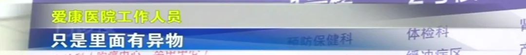 爱康医院的工作人员解释:到现在没有发生什么事情,从侧面证明,患者目前没有什么大的伤害,小的伤害不太清楚,我们调取了厂家供货,厂方认为是没有其它问题,只是有异物,经过灭菌消毒的。有没有对病人造成影响?我们可以告诉你,这个肯定是没有的,如果有,这个病人肯定是会发生一系列变化。