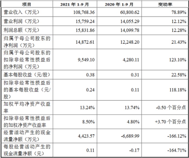2021年1-9月,盛美上海实现营业收入(未经审计)10.88亿元,同比增长78.89%;实现归属于母公司股东的净利润(未经审计)1.49亿元,同比增长21.43%;实现归属于母公司股东的扣除非经常性损益后的净利润(未经审计)9549.10万元,同比增长123.10%;经营活动产生的现金流量净额(未经审计)为4423.57万元,上年同期为-6689.99万元。