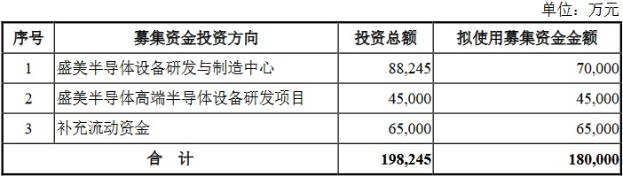 盛美上海本次发行募集资金总额为36.85亿元,扣除发行费用后,募集资金净额为34.81亿元。该公司最终募集资金净额比原计划多16.81亿元。盛美上海近日披露的招股说明书显示,其拟募集资金18.00亿元,拟分别用于盛美半导体设备研发与制造中心、盛美半导体高端半导体设备研发项目和补充流动资金。