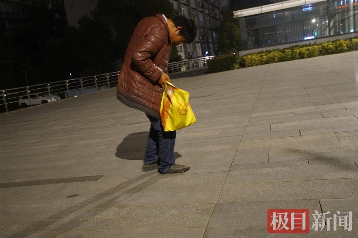 一个中年男子,颈部异常佝偻,身着破旧的棕色皮衣,右手拎着一个黄色帆布袋。17日凌晨1时左右,正在夜拍的摄影师小刘遇到了流浪的老刘。经过攀谈,小刘发现,老刘意识清楚,但因病背部僵直,身体无法直立。