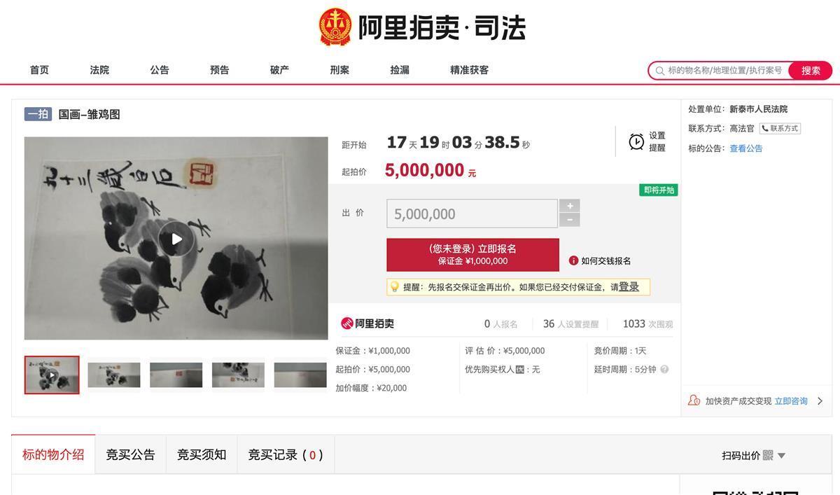 进行拍卖的涉黑资产除了这个靓号,还包括书画83件,评估价近967万元,其中一幅国画《雏鸡图》,落款为齐白石,起拍价500万元,保证金100万元,将于12月6日10时开拍。