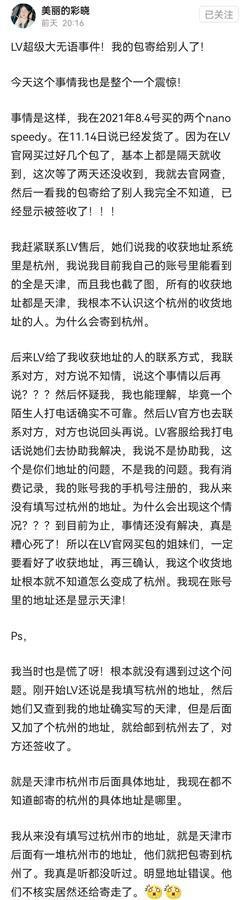 极目新闻记者注意到,网名为“美丽的彩晓”的网友称,今年8月4日她买了两个nano speedy LV包,LV官方说11月14日发货了,等了两天还没收到,官方去查发自己的包被寄到杭州,且显示被签收了。