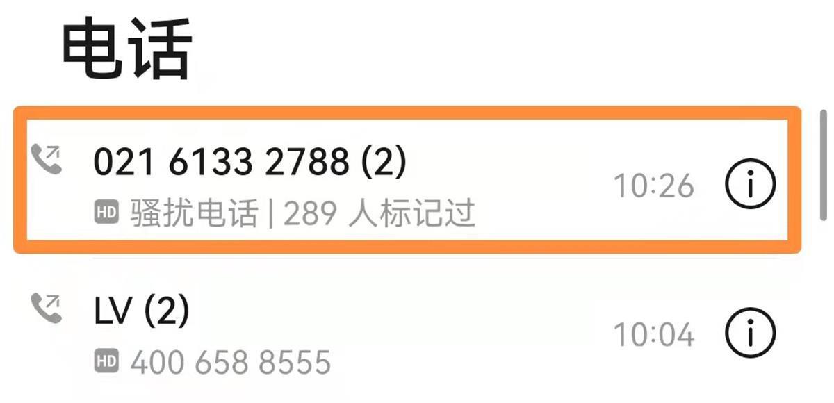 第二个电话让翠翠起了疑心。该电话号码自称是LV官方,是一个021开头的座机号码,被标记为快递送餐电话,翠翠网上查询显示为诈骗电话。
