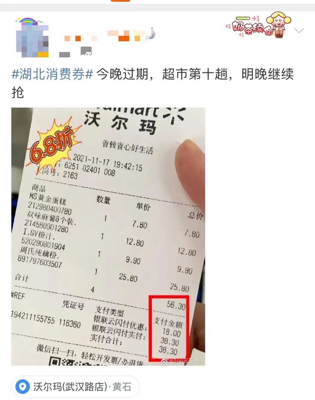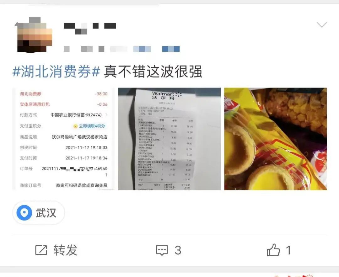 11月17日是上一批湖北消费券有效期的最后一天。当晚,有不少微博网友晒出卡点消费的账单,“68折”“吃到撑”的湖北消费券让大家直呼“真香”,还有的已经摆好姿势准备开抢。