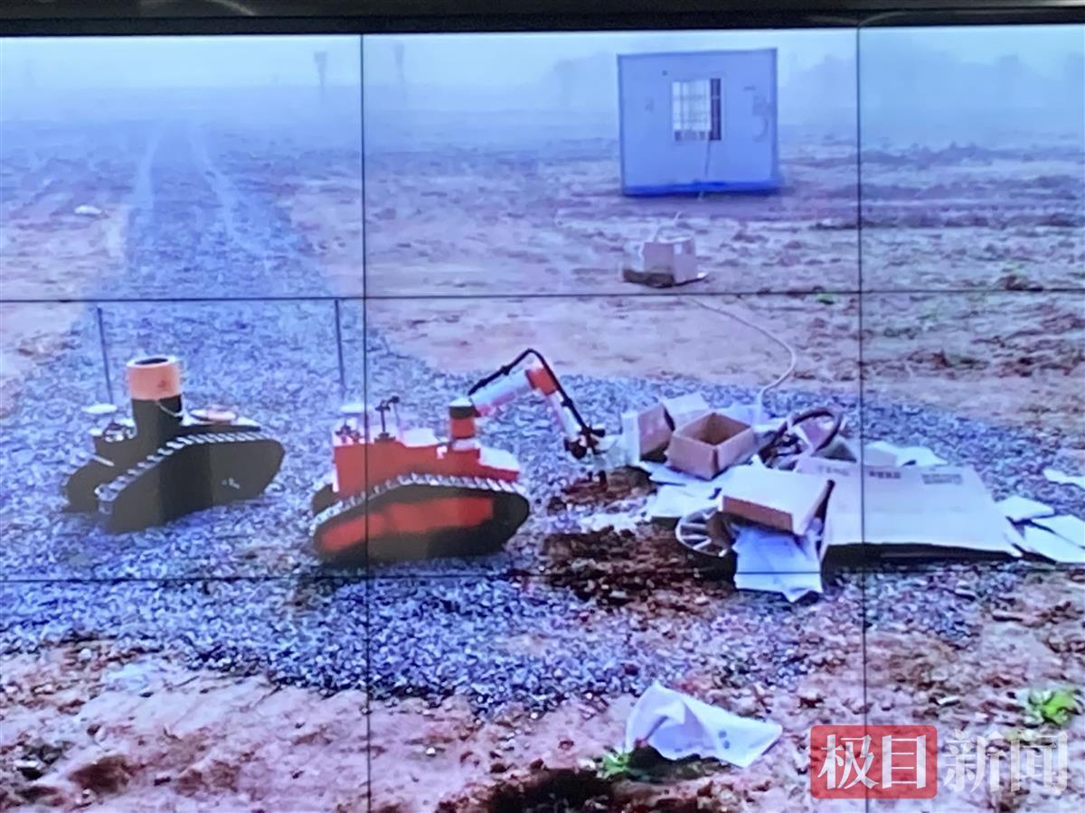 通过现场指挥部实时传输的画面,指挥部看到,两台车型的机器人在操作下,驶入内警戒区,来到放射性源旁。只见一台机器人顶部有一只机械臂,另一台机器人顶部设置着一个源罐,用于存放放射源。通过远程操控,机械臂伸长至近一米,一把牢牢抓起放射源,对准源罐口。在画面中,可以清晰地观察到,放射源包壳完好。