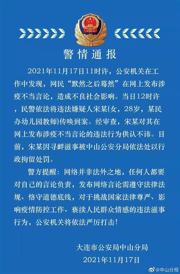 据大连市公安局中山分局的警情通报显示,当日中午12时许,该局民警依法将违法嫌疑人宋某(女,28岁,某民办幼儿园教师)传唤到案。经审查,宋某对其在网上发布涉疫不当言论的违法行为供认不讳。目前,宋某因寻衅滋事被依法处以行政拘留。