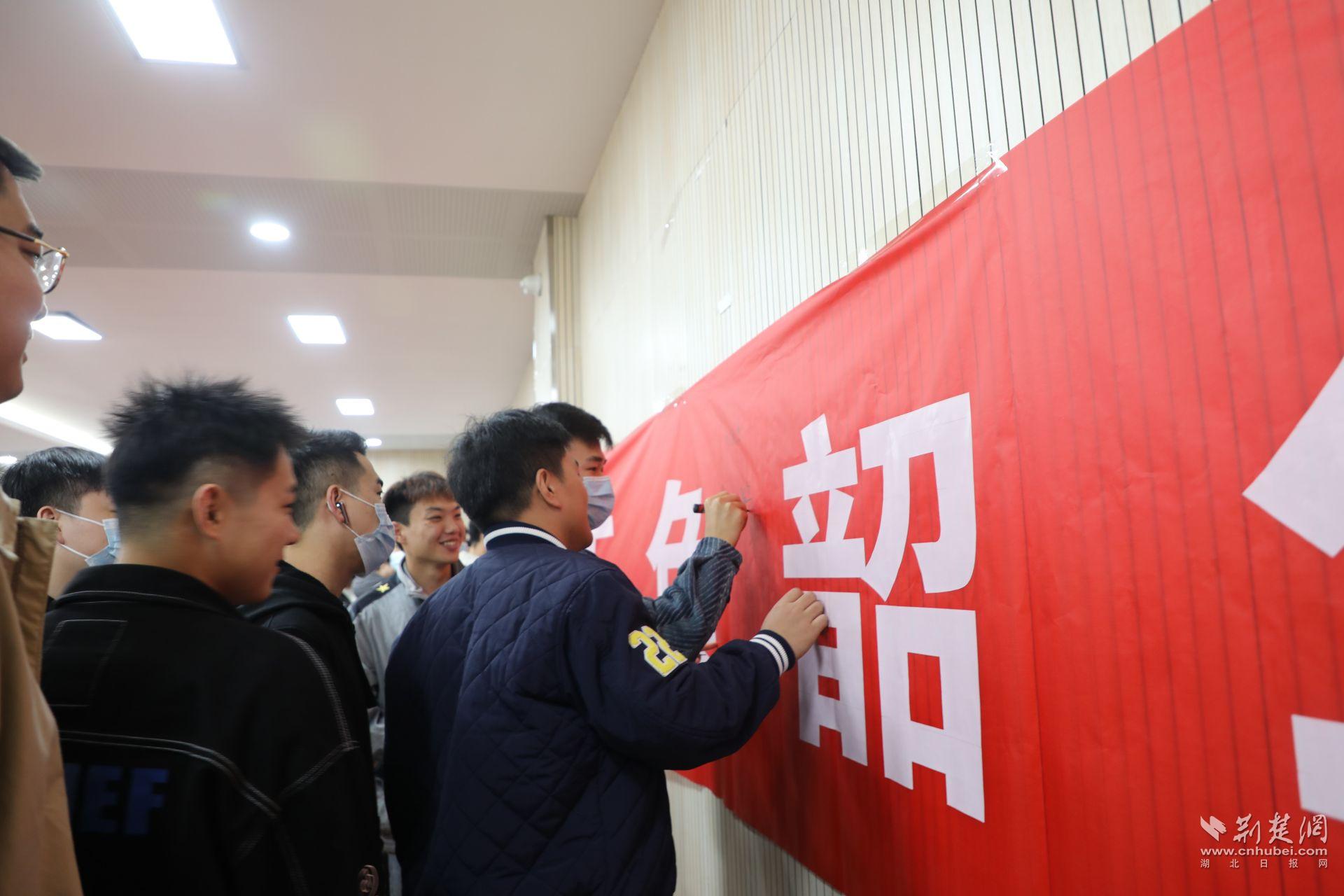 图为参军意愿强烈的武汉东湖学院大学生纷纷签名。通讯员供图