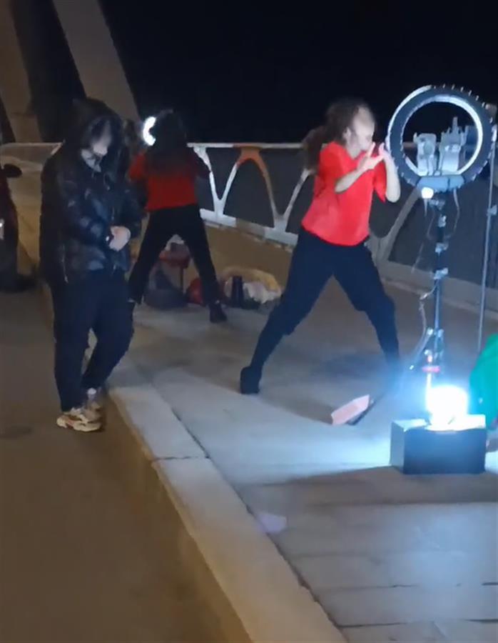 网传视频显示,在一座大桥的台阶上,有很多人面前支撑着补光灯和手机,手拿话筒表情夸张地在镜头面前又唱又跳,但是没有发出声音。