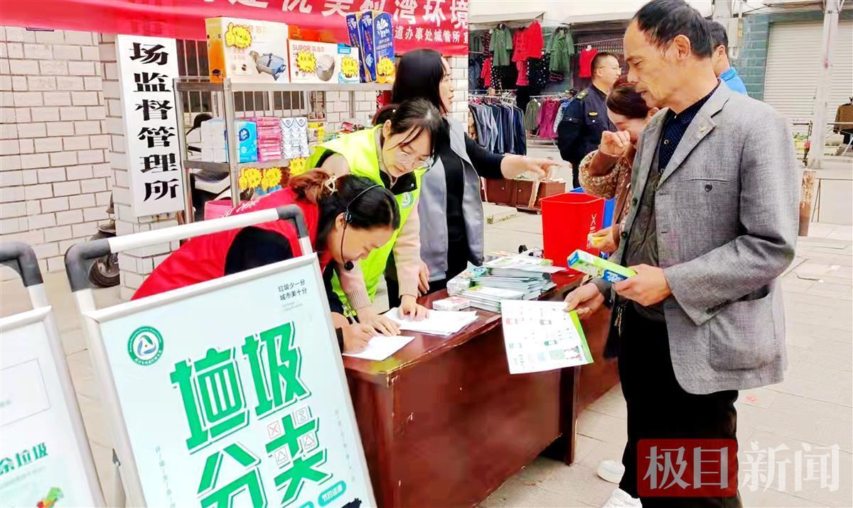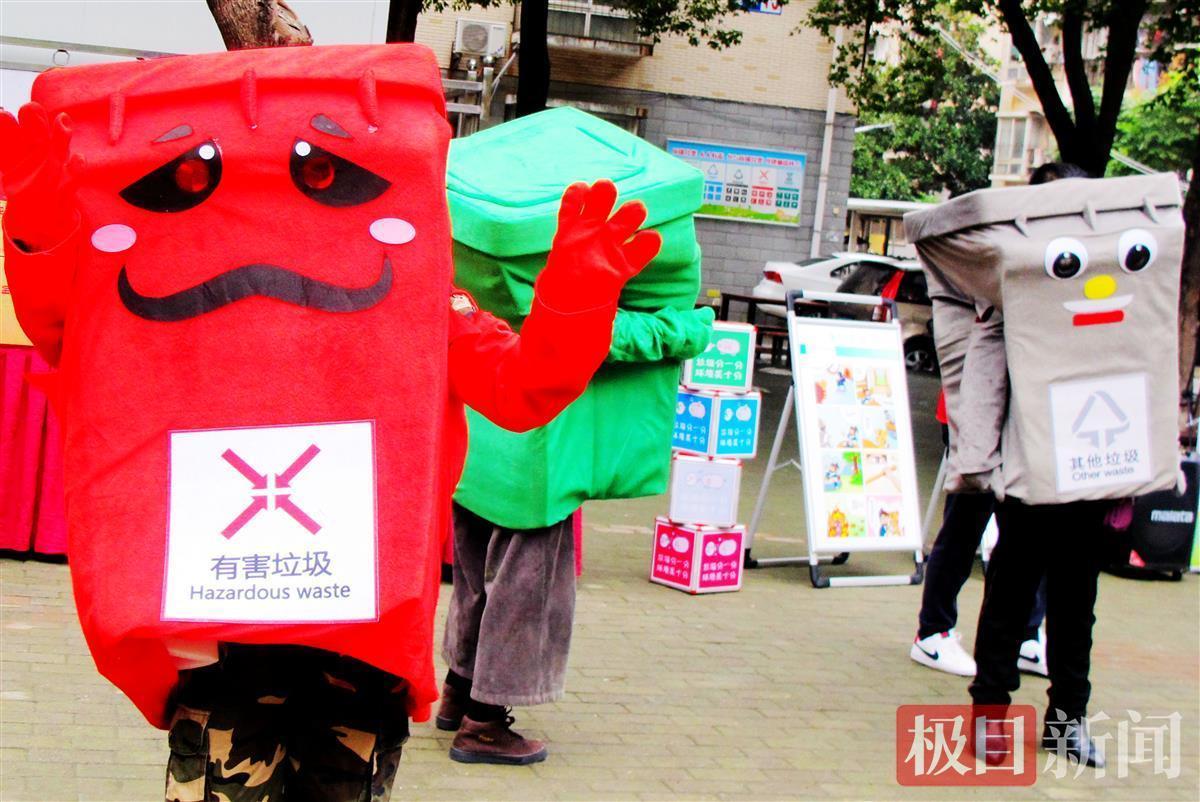 垃圾分类大头娃散发宣传单,宣讲垃圾分类知识。11月20日,武汉市东西湖区东山街集镇街头,居民们现场纷纷使用家中闲置的纸品、废旧塑料瓶、过时棉织品等可回收垃圾,前往设在集镇街头的便民可回收垃圾易物“超市”,兑换到卫生卷纸、家用小电器的日用生活用品。