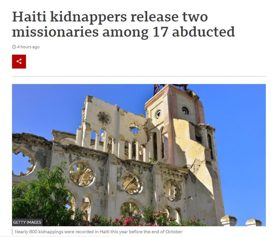 据BBC报道,当地时间11月21日,在被海地黑帮绑架一个多月后,17名美国和加拿大的传教士中的两人已经获释。