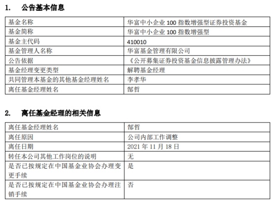 中国经济网北京11月22日讯 近日,华富基金管理有限公司发布基金经理变更公告,郜哲因公司内部工作调整离任华富中小企业100指数增强型(410010),该基金由李孝华独立管理。