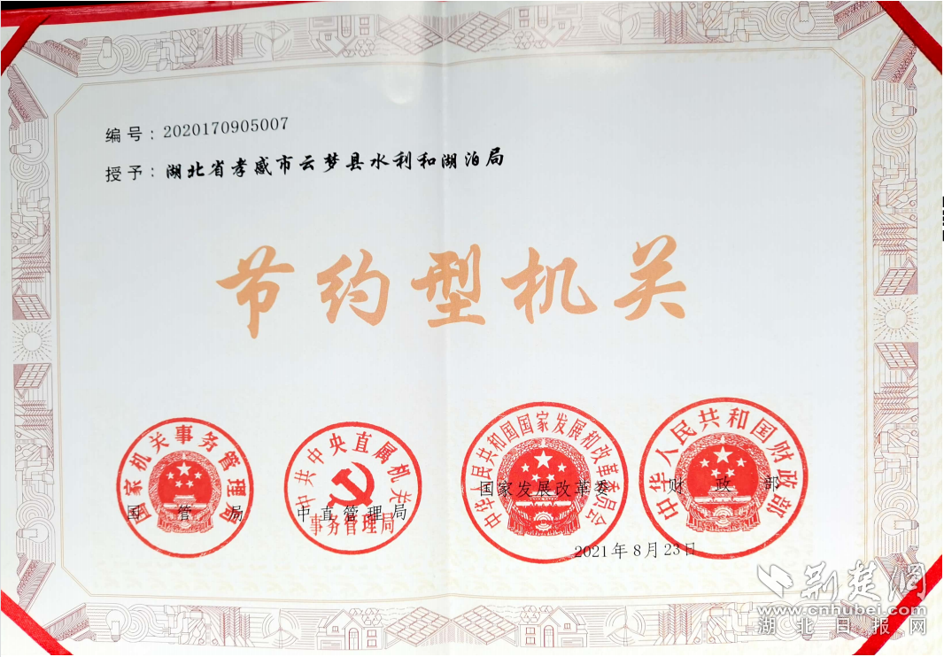 云梦水利和湖泊局获“节约型机关”。黄敏 供图