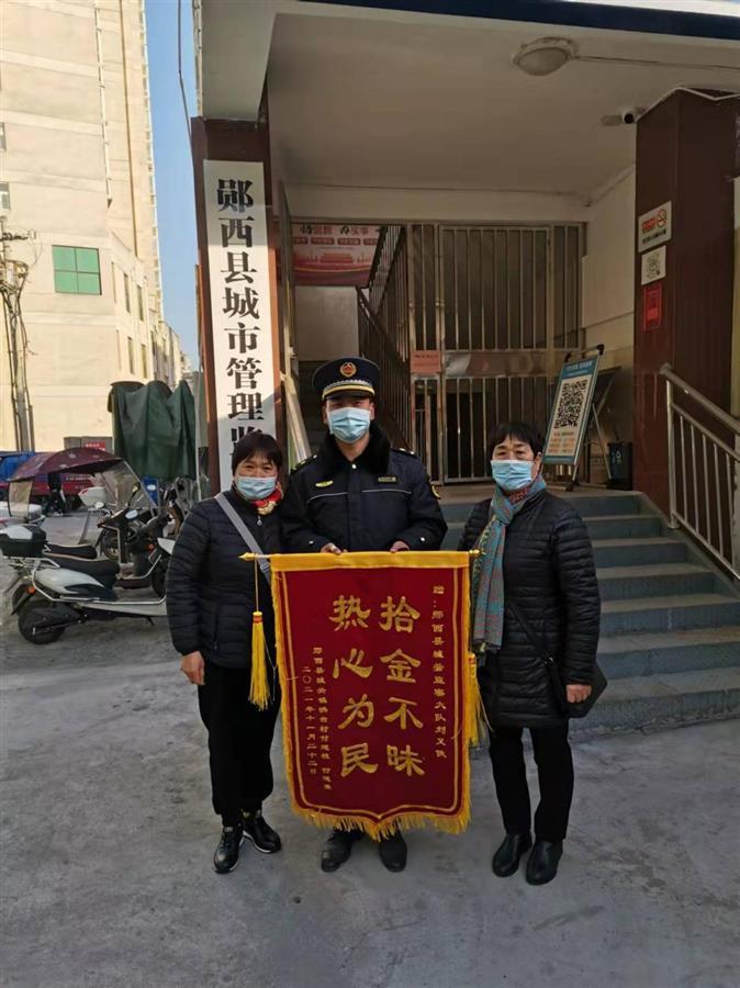 “太感谢你了,我本以为这袋千把块钱的猪肉丢了就回不来了,没想到现在你让它失而复得,你的行为真是太让人感动了。”11月22日一大早,家住郧西县洪台小区居民付女士姐妹两人,将一副印有“拾金不昧、热心为民”的锦旗,亲自送到郧西县城管执法队员刘义侠手中,并连声表示感谢。