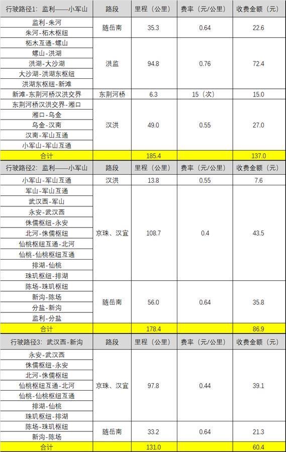 荆州-武汉不同行驶路径收费情况