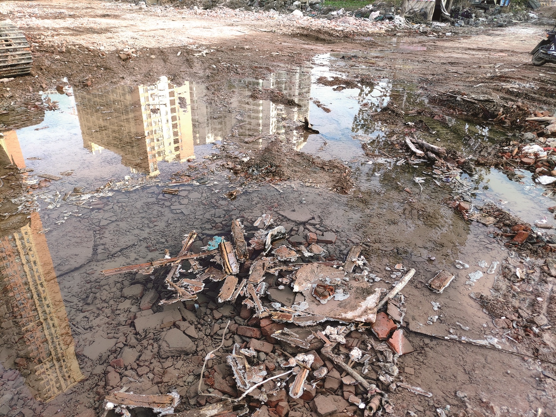19日,极目新闻记者在附近居民的指引下找到了该漏水地段。记者发现,该地段正在进行拆迁工作,路面堆满了石头、水泥块、碎砖块等建筑垃圾,垃圾下面不断有清水汩汩冒出,形成了一个水洼(如图),目测有四到五处漏水点。