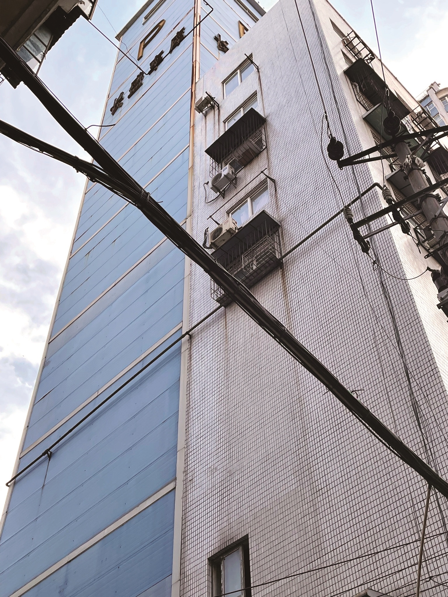 11月11日下午,极目新闻记者来到位于江汉三路的长盛大厦。大厦一侧,一栋蓝色的停车楼显得十分醒目,其外墙上有“长盛车库”四个大字。然而,记者围着该大厦转了一圈,却没找到该车库入口。后来,在当地居民指引下,终于在路边看到一个不起眼的卷闸门。门上方的招牌字已被拆除,只能依稀辨认出“自动车库入口”等字样。其旁边的玻璃窗上,还有一个蓝色的“P”字。记者抬头看到,紧挨着车库的居民楼有9层,停车楼比居民楼还要高出三分之一。