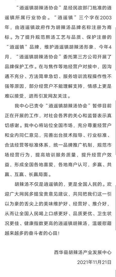 此前,逍遥镇胡辣汤协会主管部门——西华县胡辣汤产业于11月21日发展中心发布公告称,“逍遥镇”三个字在2003年由逍遥镇政府作为胡辣汤品牌名称被注册为商标,逍遥镇胡辣汤协会自今年4月开始委托第三方开展品牌保护工作。在与焦作等地经营户对接中,因沟通不充分、方法简单急切、服务培训流程操作性不强等原因,部分经营户不能理解和支持,引起网友关注。现已责令逍遥镇胡辣汤协会暂停目前正在开展的工作。