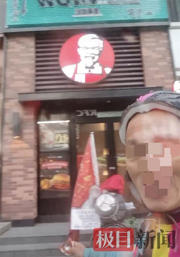 网传的视频里,一名身穿骑行服的男子说:“大家伙过来看一下哈,我今天去肯德基要水喝要纸巾,被肯德基骂出来了。”在他身后,一辆放满了生活用具并插着红色旗帜的单车,停放在一家肯德基门店门口。