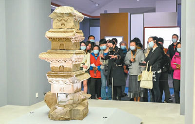 策展人徐颖为观众介绍北宋灵峰寺石塔。叶宾得摄