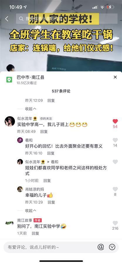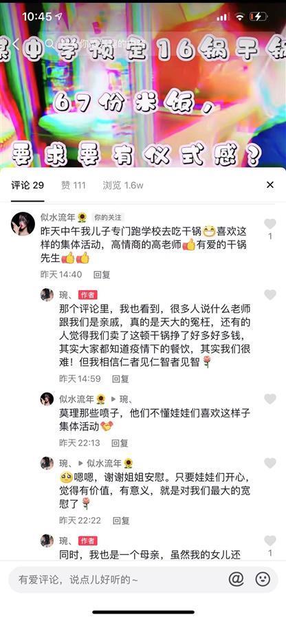在张女士的视频评论区,还有多位学生家长留言,其中一位家长说:“昨天(21日)中午我儿子专门跑到学校去吃干锅,喜欢这样的集体活动。”
