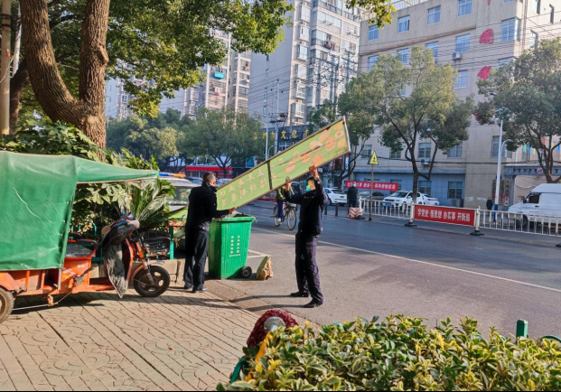 德安北路、德安中路是安陆市重要的交通要道,车流量大,但街道两侧的人行道长期被商户“占为己有”,乱牵乱挂、乱堆乱摆、乱停乱放现象突出,不仅影响市民出行,而且严重影响市容市貌。行动中,安陆市城市管理执法大队共出动6个中队30多名执法人员,从护国菜场出发,沿途开展综合整治。整治户外经营,取缔德安北路、德安中路占道经营的固定摊点、流动商贩;整治临街立面,全面清理德安北路、德安中路乱拉绳索、乱牵横幅等现象;整治户外广告,清理各类出店、占道流动立式广告牌和临街残缺破损的户外广告牌,规范门头牌匾。