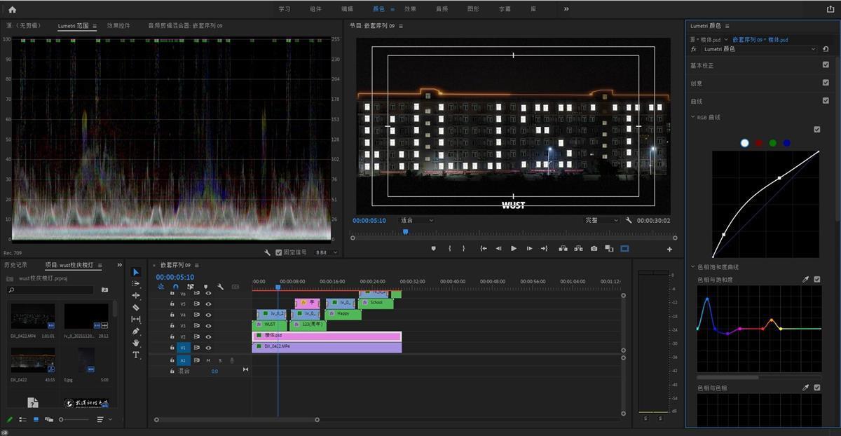 在PS里扣出一个黑着的窗户,并对着原来的窗户位置一个一个放上去,覆盖每一个亮着灯的窗户。近两百多个图层,扣出一个亮着灯的窗户作为模板,最后在PR里导入楼体psd,按照WUST字样等挨个摆放好位置……这一系列操作花去了徐萌一周的时间。