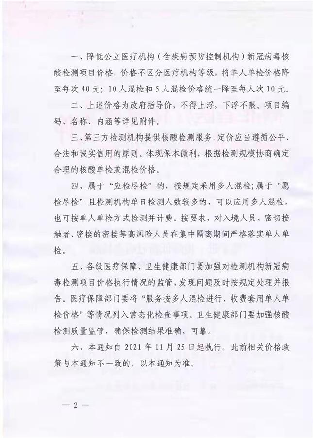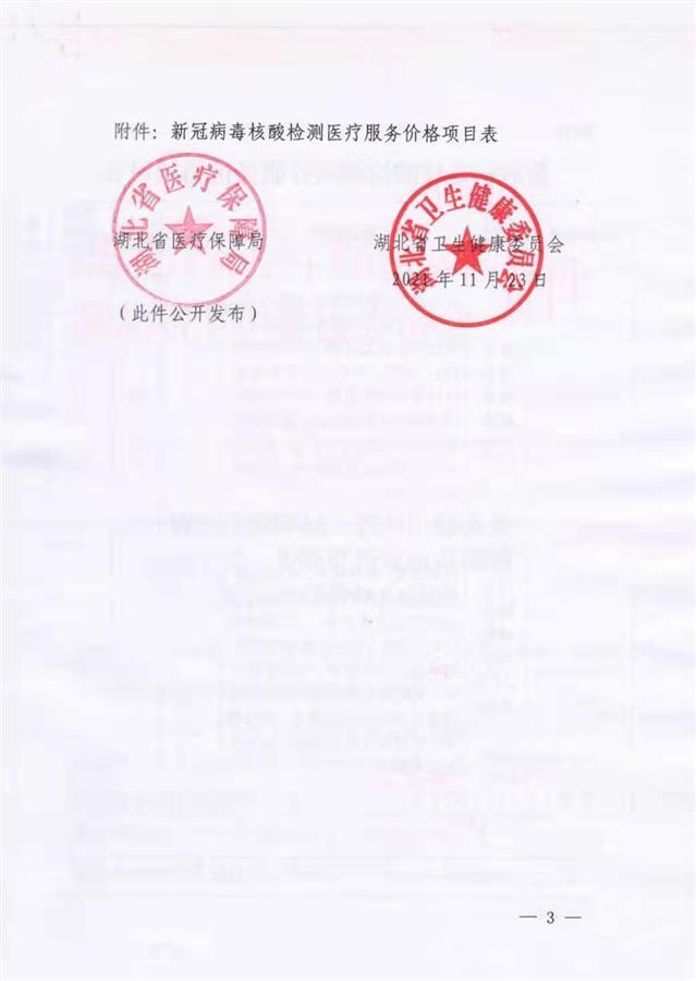 为切实做好新冠肺炎疫情常态化防控工作,进一步减轻群众核酸检测费用负担,11月23日,湖北省医保局联合省卫健委印发《关于进一步降低新型冠状病毒核酸检测项目价格的通知》,明确自11月25日起湖北省公立医疗机构新冠病毒核酸检测单人单检由60元/次下调至40元/次,10人混检和5人混检价格统一降至每人次10元。此次调整是湖北省对新型冠状病毒核酸检测项目的第五次动态调整。