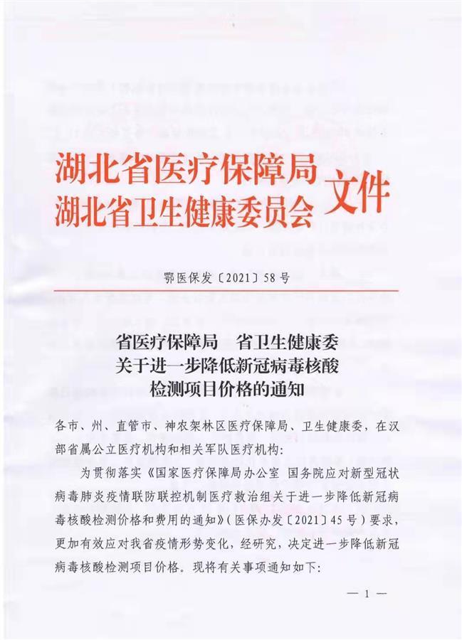 据了解,新冠肺炎疫情暴发以来,湖北率先启动新型冠状病毒相关检测试剂盒集中采购工作,大幅降低试剂盒中选价格,核酸和抗体试剂盒分别下降81%和72%;率先将核酸检测、抗体检测等项目临时纳入医保目录,大幅降低个人检测成本;动态调整检测项目价格,五次下调核酸检测价格,不断减轻群众医疗负担。8月9日,湖北将新型冠状病毒核酸检测项目的最高限价由每次80元调整为60元。率先设立混合检测项目,规定公立医疗机构混合检测10人份的最高限价为每人次15元。
