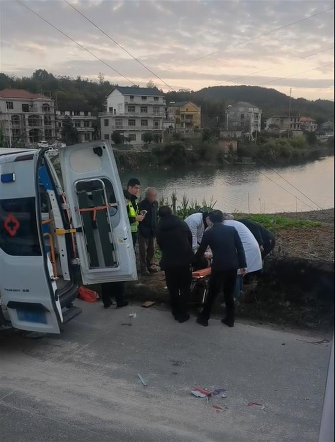 多段网络视频显示,湖南娄底涟源市028县道渡头塘镇东风村便民服务中心附近,一辆黄色校车冲出路面,侧翻在路边的菜地里。几名交警在现场处置,一辆救护车停在现场。救护人员从路边将一名女性伤者抬上担架,伤者鼻孔处流出鲜血,躺在担架上没有反应。