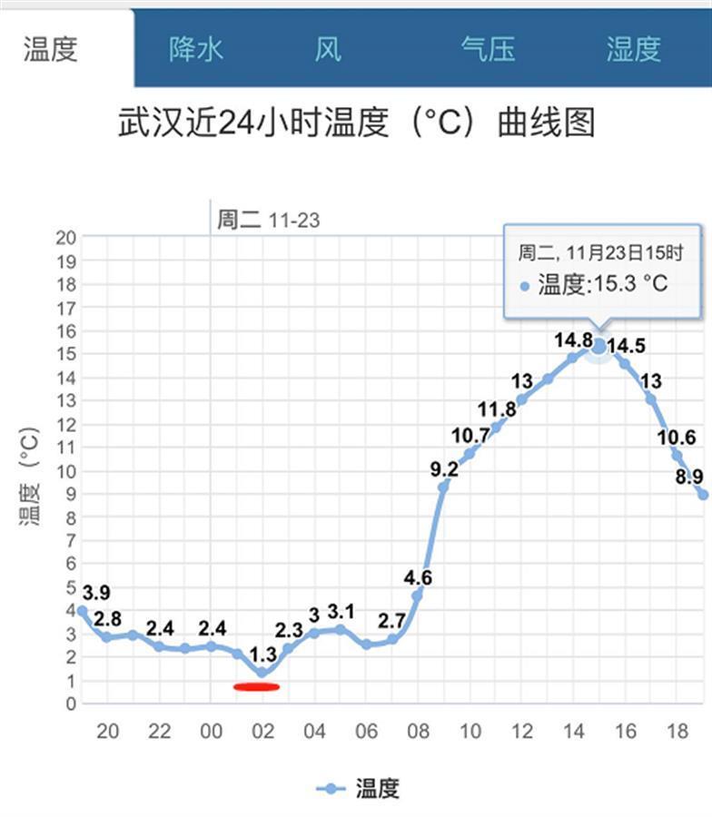 1.3℃出现在23日凌晨2时,随着阳光热情温度拉升,午后3时武汉气温冲至15.3℃,有了些许温暖。