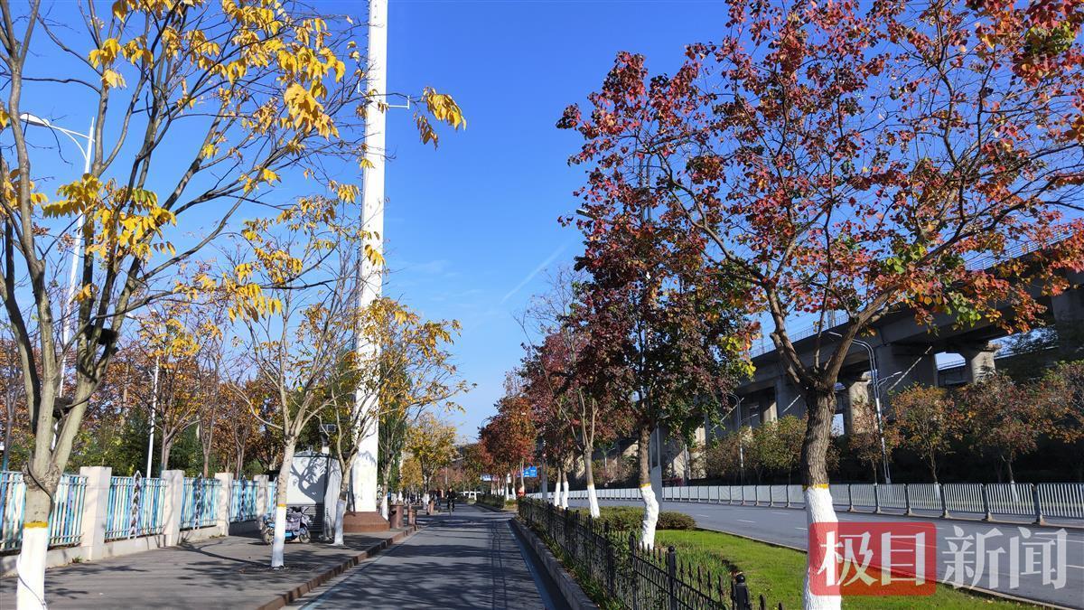 金色的腰带别在中间,白色的“半裙”在蓝天白云映衬下仙气飘飘,青山区建设十路两旁的道行树乌桕和无患子换上冬日“新装”,十分亮眼。