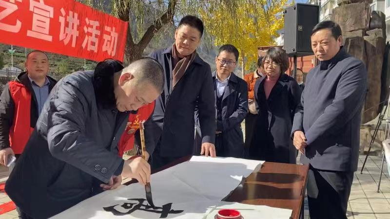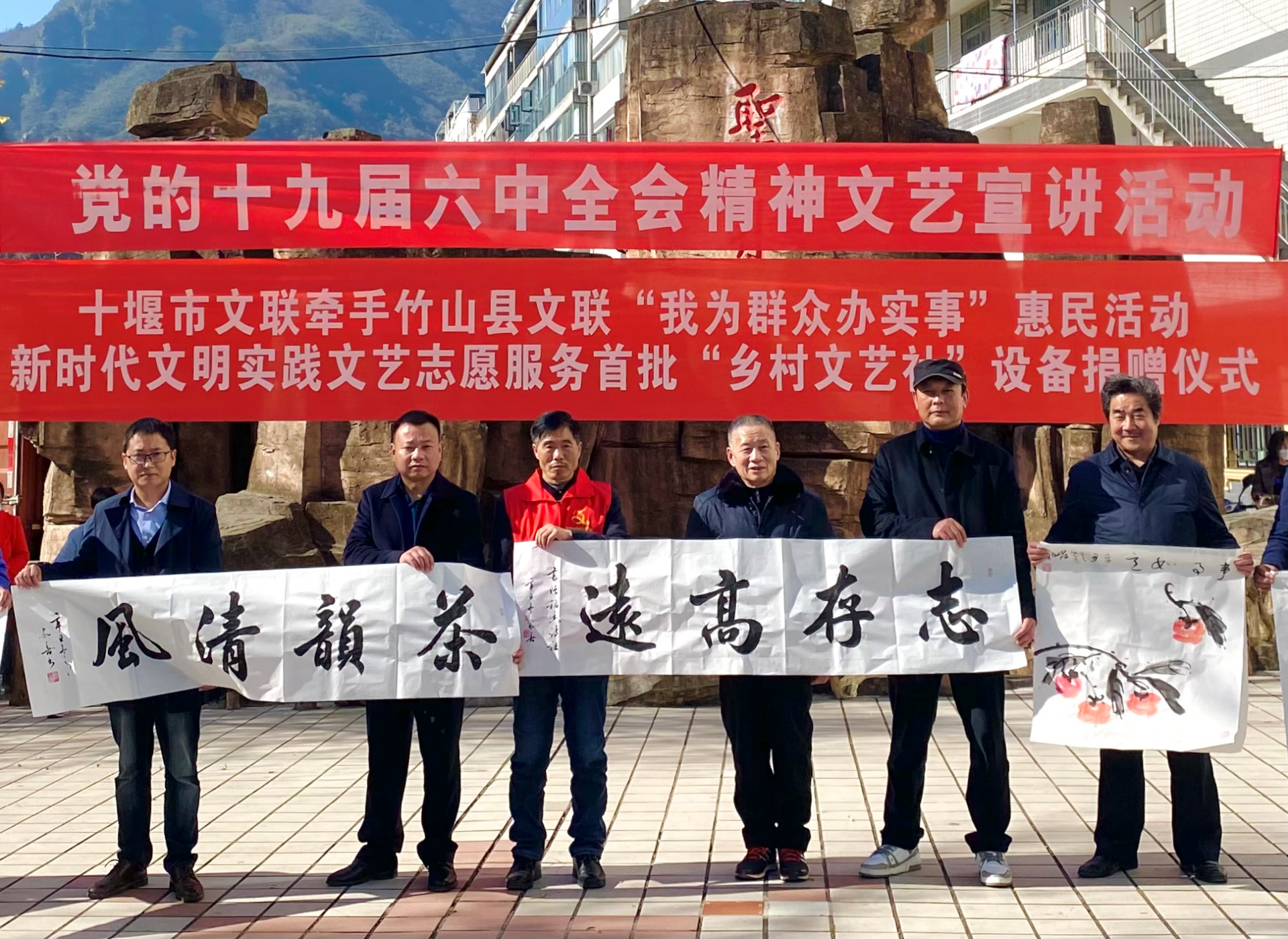 据悉,此次得胜镇稻香诗社联合十堰市、竹山县文联开展党的十九届六中全会精神文艺宣讲活动,邀请来自全市三十多名音乐家、书法家、美术家、诗友用文艺的语言讲活党的理论政策。市书协主席黄家喜创作的书法作品“茶韵清风”“乡村振兴文明先行”得到了百姓一致好评;市美协、音协、诗歌学会十余名专家激情演绎了舞蹈《母亲是中华》、歌曲《红旗飘飘》《喜洋洋》等,倾情诉说了党的百年风雨历程和人民群众美好生活的生动画面。