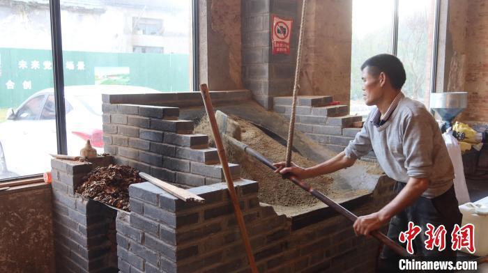 油茶果碾压成粉末后,炒茶师傅对其进行高温烘炒。 董易鑫 摄