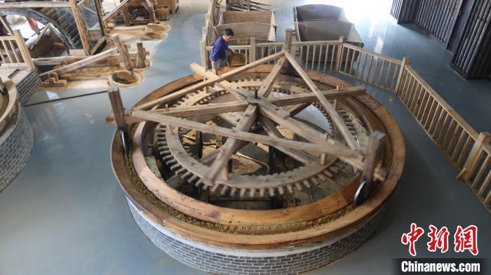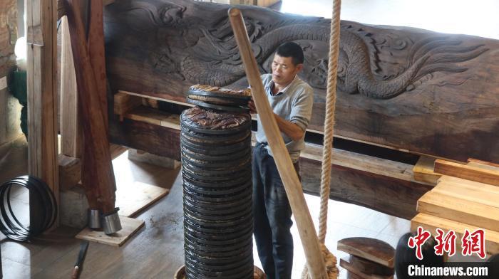 “茶饼”依次进入木制榨油器。 董易鑫 摄