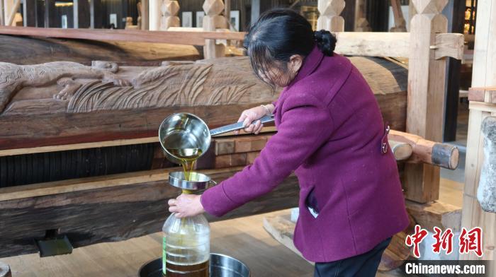工人把木制榨油器中榨出的茶油装进容器中。 董易鑫 摄