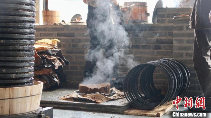 油茶师傅将水蒸后的油茶粉末压制成“茶饼”。 董易鑫 摄