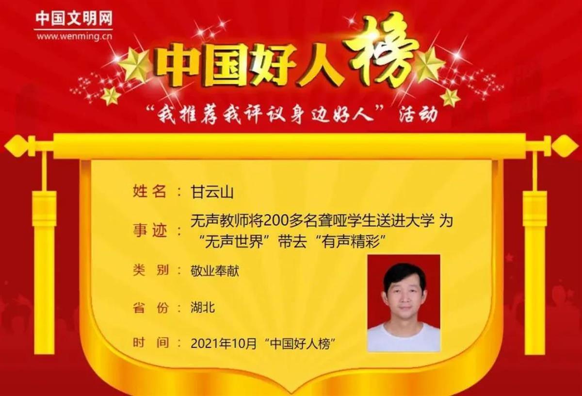 甘云山是湖北省武汉市第一聋哑学校教师,在一批批聋哑学生的求学路上,甘云山用无声的语言,将200余名聋哑学生送进大学,帮这些残疾孩子树立起山一样的坚定信念。对孩子们来说,甘云山不仅是教书育人的老师,更是备受依赖的“爱心爸爸”。2015年,甘云山荣获“时代楷模——武汉精神践行者”称号;2021年,甘云山荣登“湖北好人”榜。