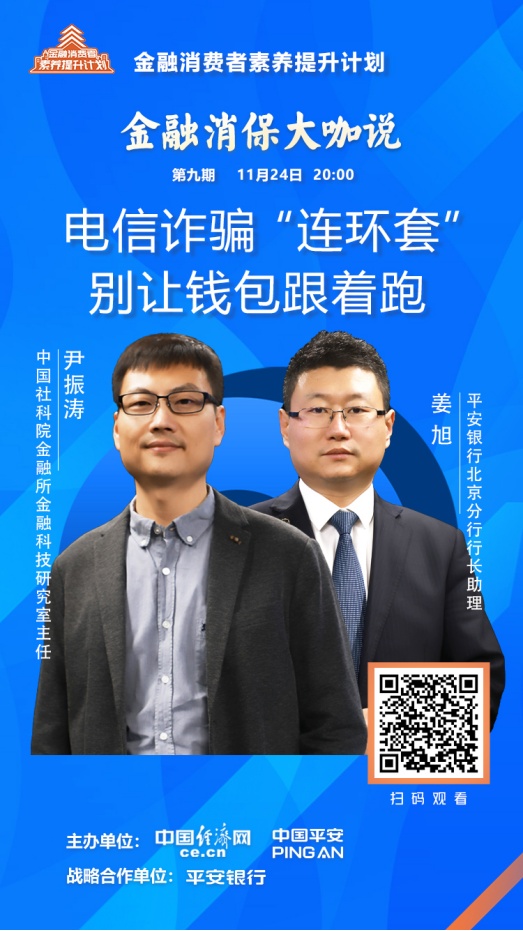 中国经济网北京11月24日讯 今晚8点,由中国经济网联合中国平安推出的《金融消保大咖说》第九期节目准时播出,本期节目的话题是“电信诈骗连环套,别让钱包跟着跑”。中国社科院金融所金融科技研究室主任尹振涛和平安银行北京分行行长助理姜旭分别结合案例对电信诈骗的套路进行分析,并为消费者,尤其是青少年和老年人支招如何有效防范电信诈骗,避免上当。