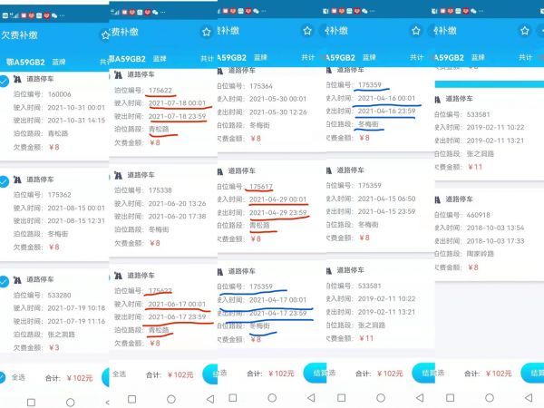 欠费记录显示同一辆车,通一时间段,驶入同一个车位,同一个时间点离开。