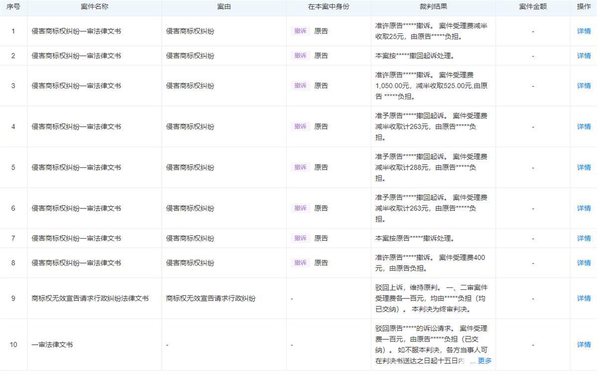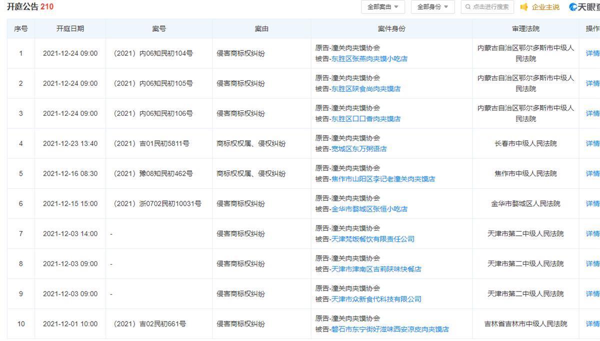 据天眼查信息显示,潼关肉夹馍协会有240条开庭公告,其中209条为原告,起诉理由主要为“侵害商标权纠纷”“商标权权属、侵权纠纷”,而被告遍及全国,有广东、河南、吉林、天津、山西、安徽等省份。上诉开庭公告的开庭时间均分布在2021年7月至12月。除此之外,在已经结案的11项中,有8项均以潼关肉夹馍协会撤诉告终。