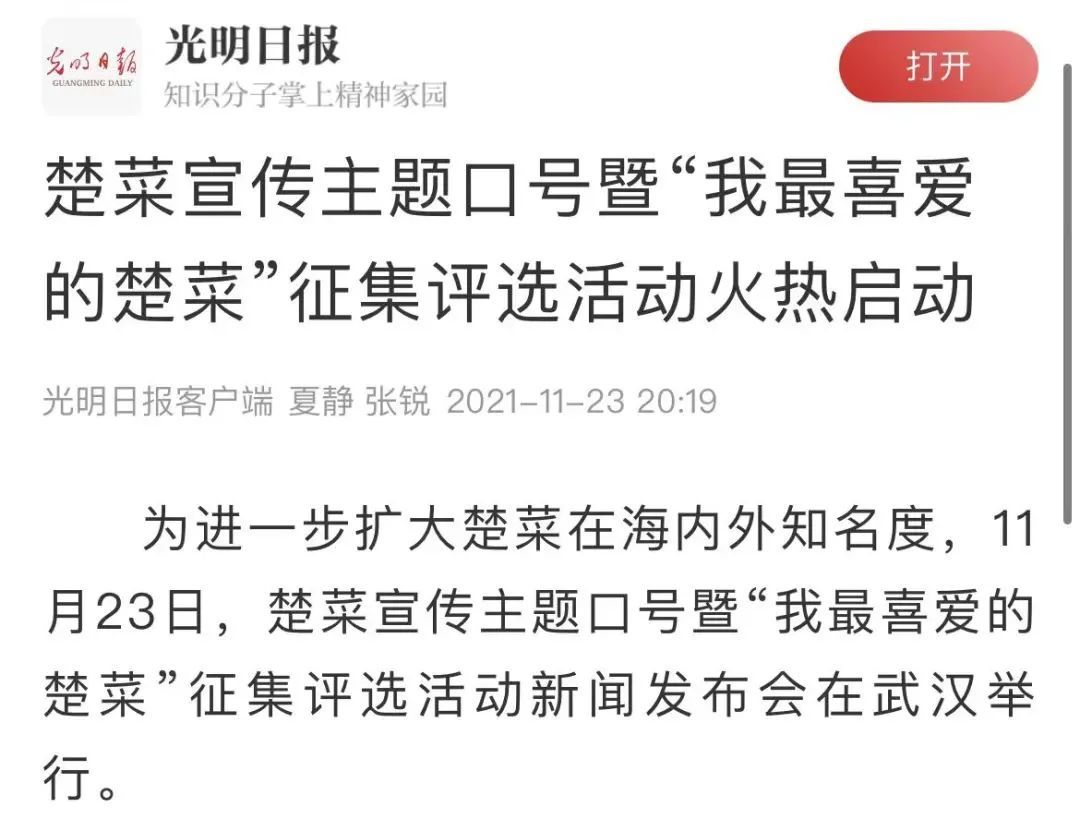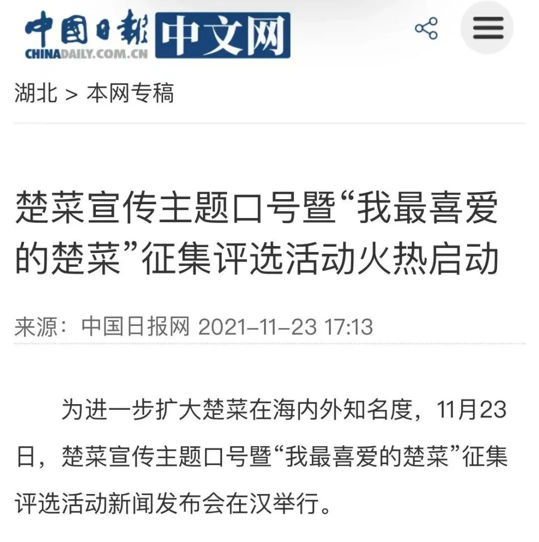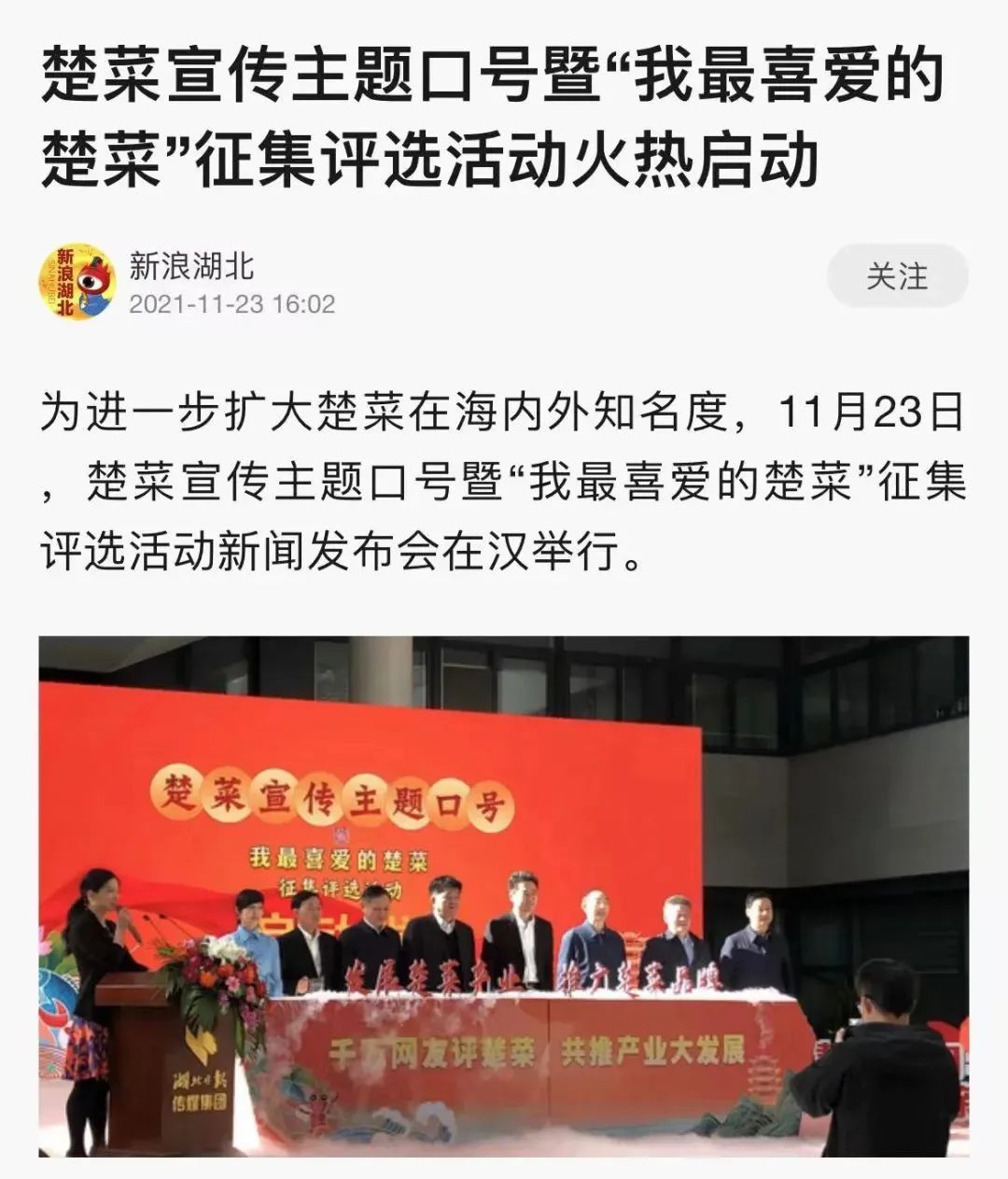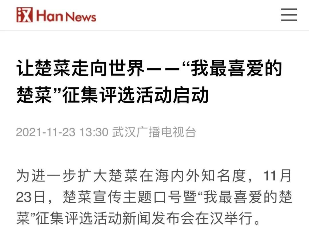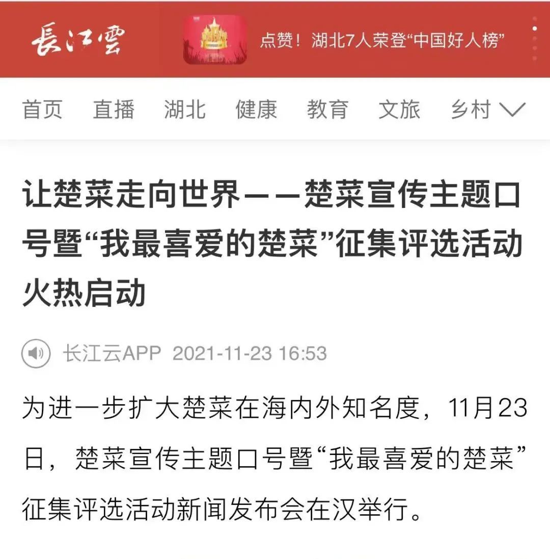 11月23日上午,楚菜宣传主题口号暨“我最喜爱的楚菜”征集评选活动新闻发布会在汉举行。会上宣布,继“我最喜爱的楚菜”征集活动之后,“楚菜宣传主题口号”征集活动也正式启动。