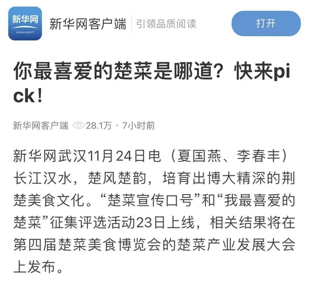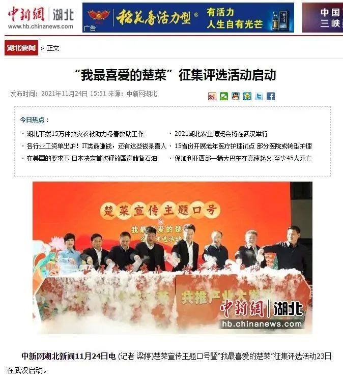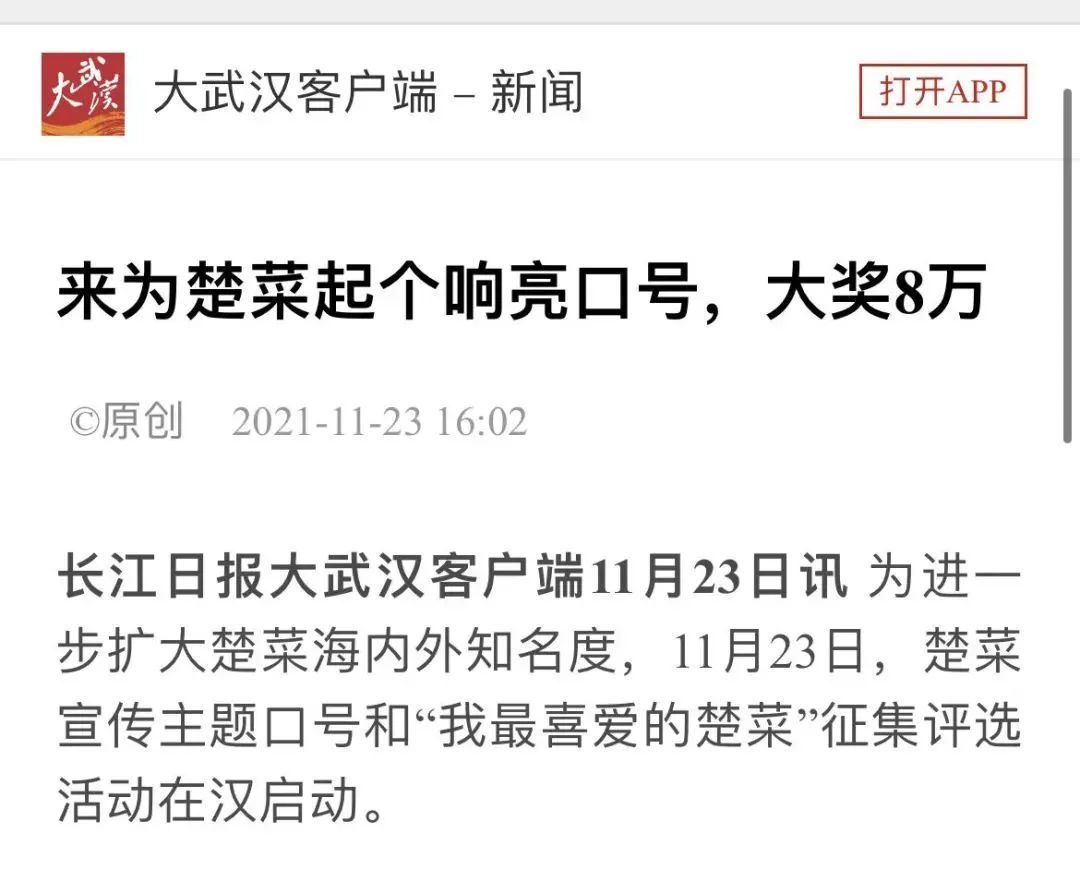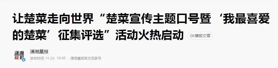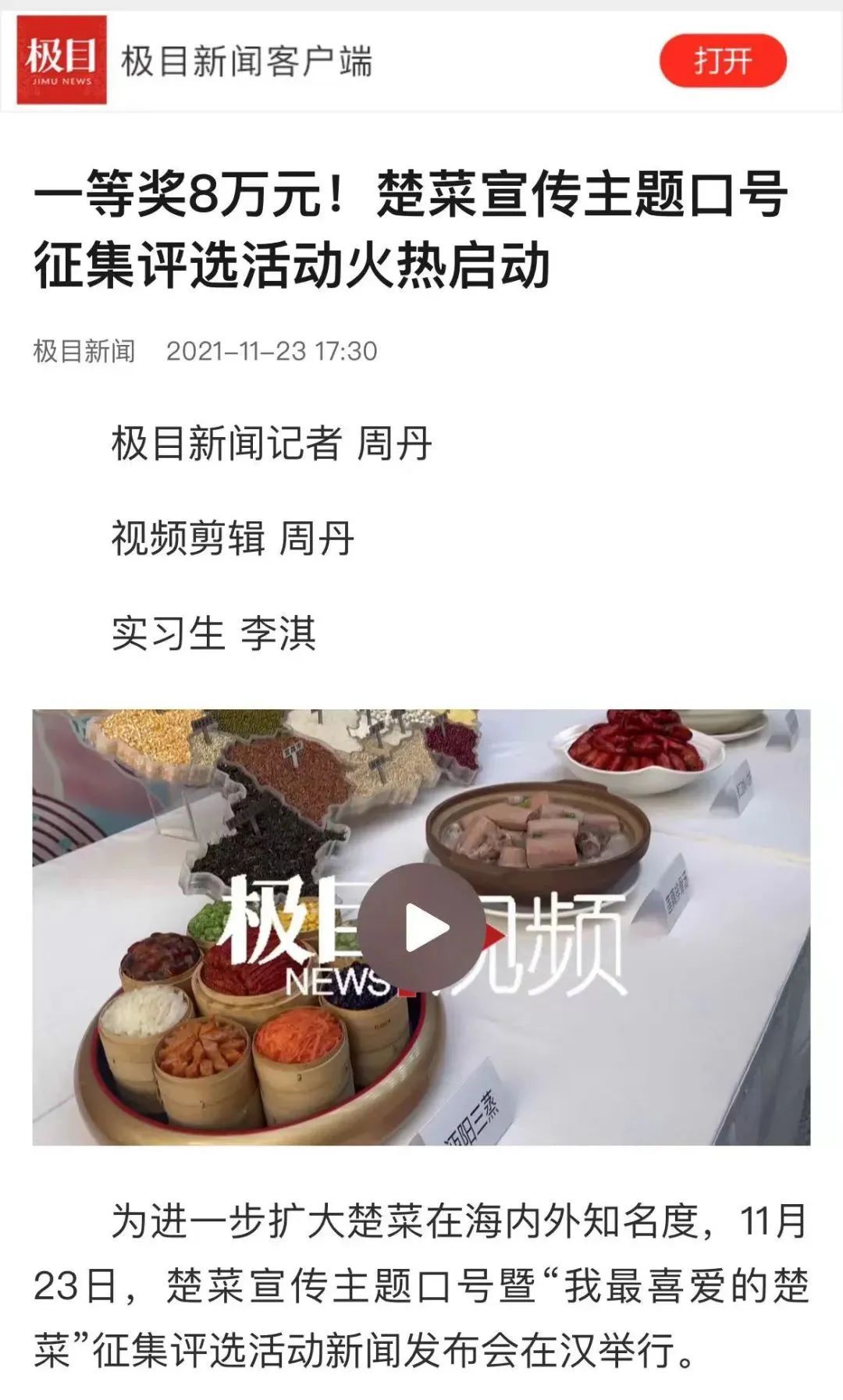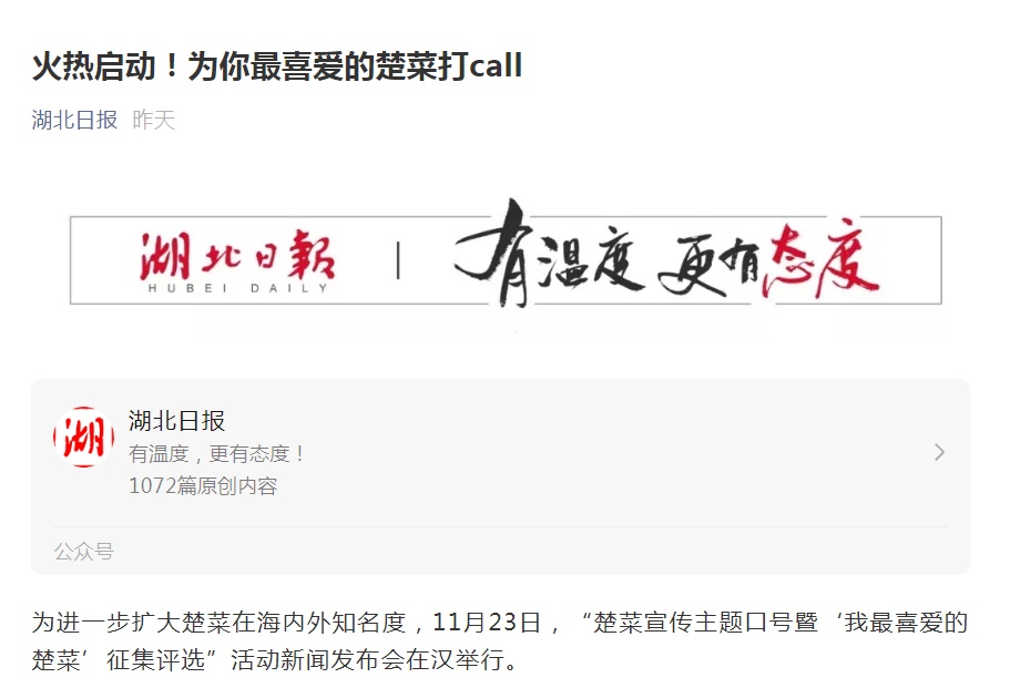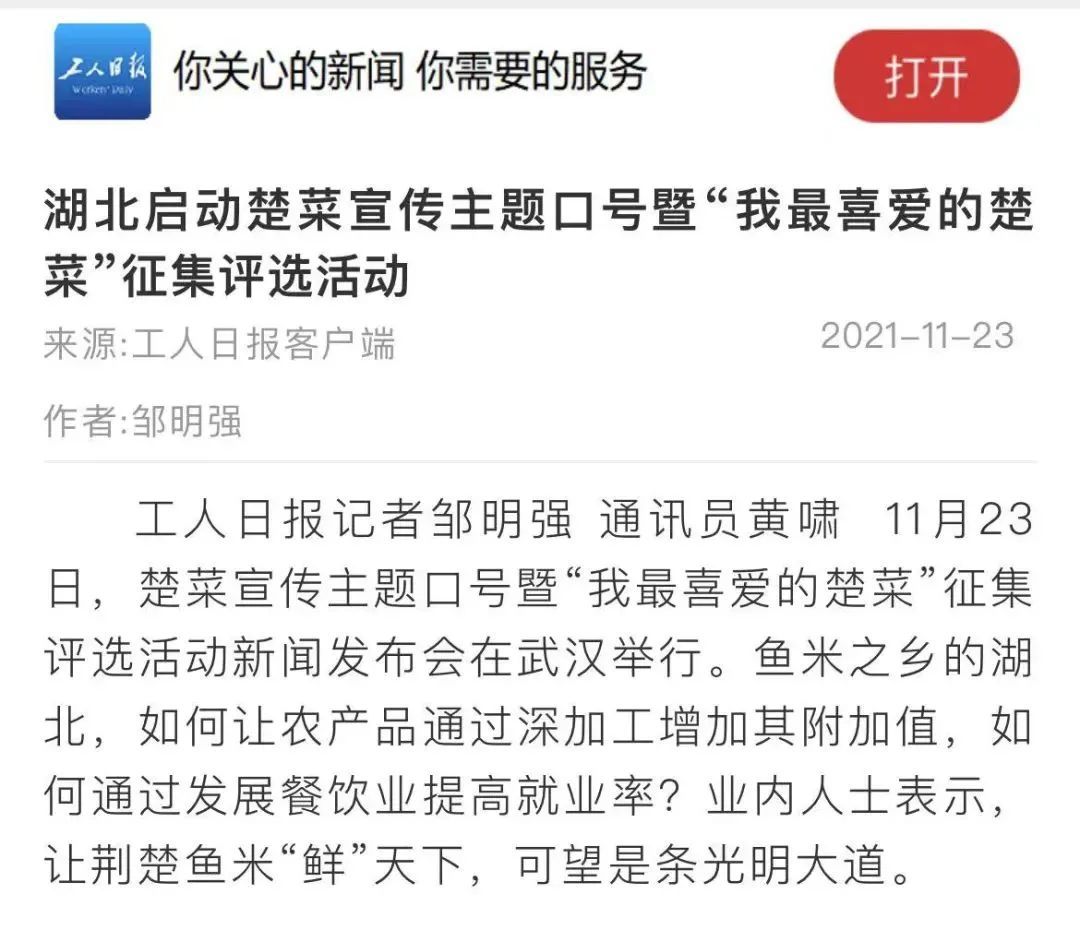 11月23日上午,楚菜宣传主题口号暨“我最喜爱的楚菜”征集评选活动新闻发布会在汉举行。会上宣布,继“我最喜爱的楚菜”征集活动之后,“楚菜宣传主题口号”征集活动也正式启动。