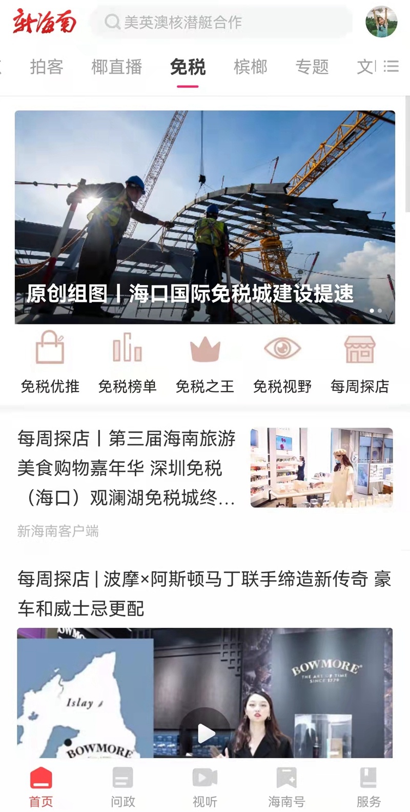 依托海南离岛免税政策,2021年1月1日,新海南客户端全新上线免税频道,重点发布免税动态和免税购物体验直播等服务内容。免税频道联合“杰西卡的秘密”App,共推出“免税优推”“免税榜单”“免税之王”“免税视野”和“每周探店”五档资讯栏目,通过图文、视频、直播等多元化形式呈现给广大消费者关于海南免税的相关资讯。